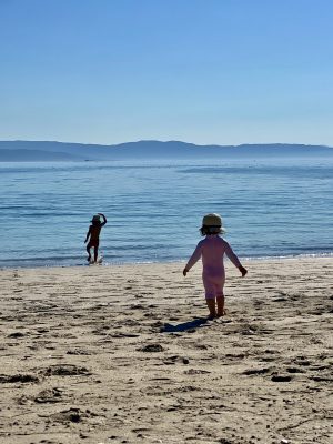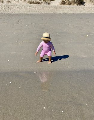 La un moment dat Ilinca cade și se udă pe costumașul ei special și roz de baie. Și curând începe să tremure… La 13.40 (chiar m-am uitat la ceas! pentru noi este foarte important cât timp doarme…) adoarme pe paturică în timp ce o țin înfofolită în brațe.