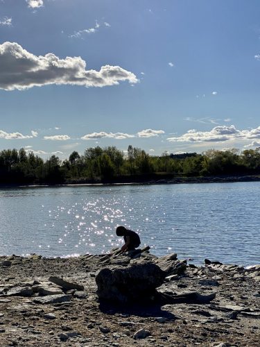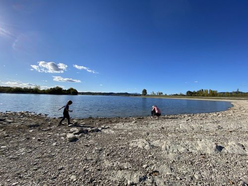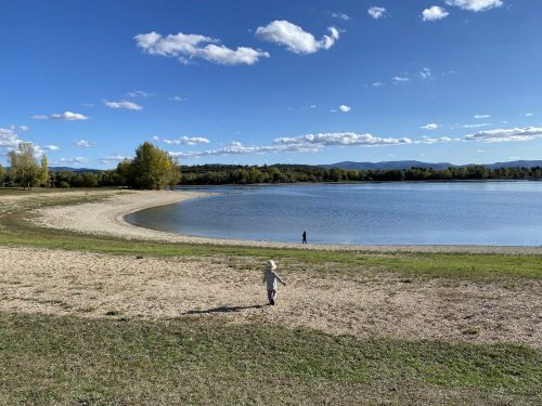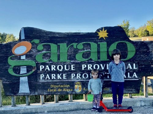 La mai puțin de douăzeci de kilometri de Vitoria descopăr însă pe park4night, când ne oprim pentru supa de prânz, un parc cu frumoase referințe,  situat la marginea orașului vechi de la care își ia numele, Garaio, pe malul lacului de acumulare Ullíbarri-Gamboa. Cu drumuri amenajate, locuri de picnic, de plajă, dușuri, parcări, oficiu de informații, fântâni, toalete și două locuri de parcare pentru autorulote. Unul de zi și unul de noapte. Am stat în cel de zi câteva ore bune, timp în care ne-am plimbat în lung și-n lat, întâi cu Gabriel mai mult și apoi cu toții mai în apropiere. Dey a fost foarte fericit zburdând de colo colo până când a apărut un câine mult mai mare și a trebuit să îl duc înăuntru. Au fost doar câțiva oameni pe acolo, unii la picnic, alții să admire locurile.