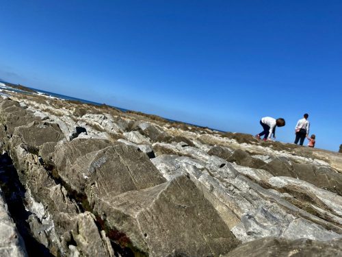 Ajungem după un drum cu peisaje superbe și ne plasăm într-o parcare în fața unui cămin de bătrâni. După ce mănâncă copiii, mergem să vedem plaja. Adevărul e că rămâi fără grai. Există un ritm și o forță de nedescris în structurile alea continue de piatră.
