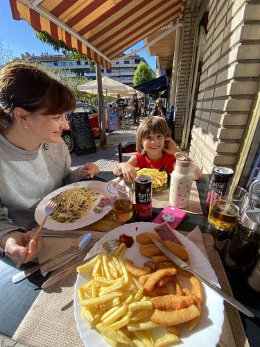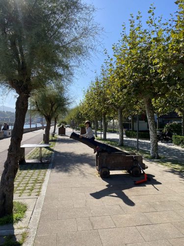 Flămânzi după priveliștea aia suprarealistă mâncăm ceva la o terasă cât doarme Ilinca în cărucior și apoi ne mutăm cu Andi în Campingul Zumaia ca să se poată spăla pe cap Adriana. Ea are nevoie de mai multă apă decât noi ceilalți iar rezervorul nostru se apropie de jumătate. Campingul este în pantă dar curat și drăguțel și cu o trambulină de care Gabriel se bucură în voie sărind până îl lasă puterile.